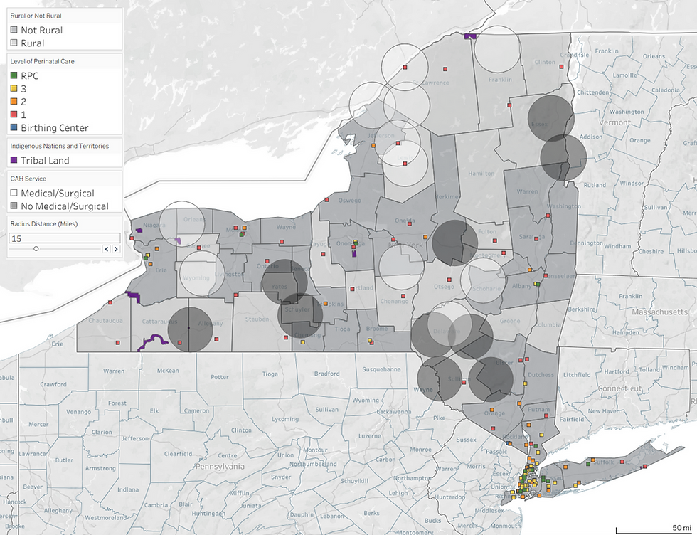 Maps developed in Tableau for this Brief show the distribution of maternity and birthing services in New York by perinatal levels of care, across rural and not rural counties, and relative to critical access hospital sites, highlighting distance-related access gaps relevant to a potential standby perinatal services pilot.